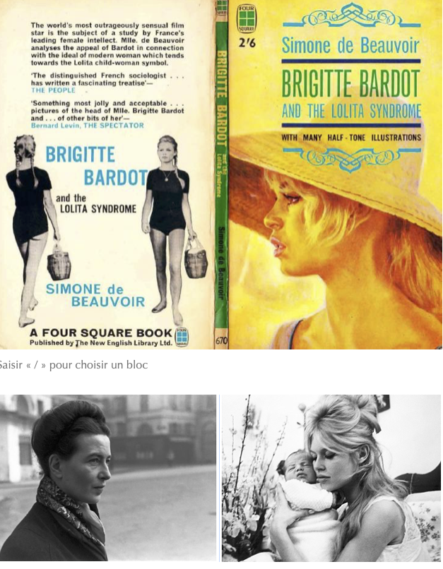 Dans l’amical et perspicace essai en anglais qu’elle lui consacra en 1959, Brigitte Bardot et le syndrome de Lolita, Simone de Beauvoir relève des contradictions qui habitent le mythe.