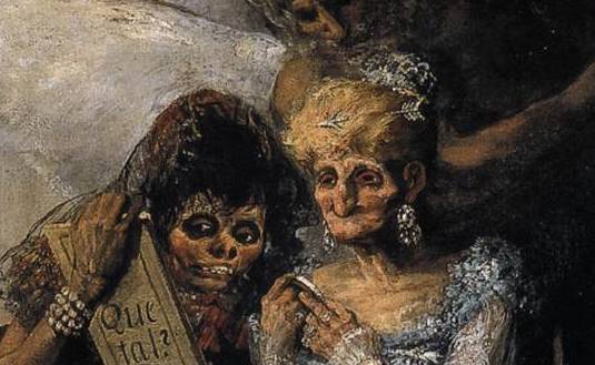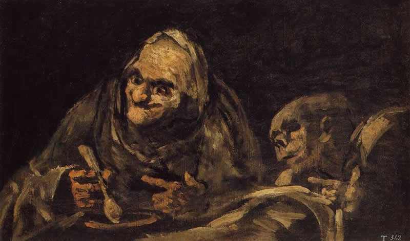 L’on sait qu’après sa grande période, Goya aigri et désabusé, sourd, emménage dans une maison aux alentours de Madrid appelée la “Quinta del Sordo'” (la ferme des sourds). C’est là qu’il s’isole, et presque fou peint directement sur les murs de la maison les “peintures noires”, transférées, par la suite sur toile, pour les exposer au musée du Prado.