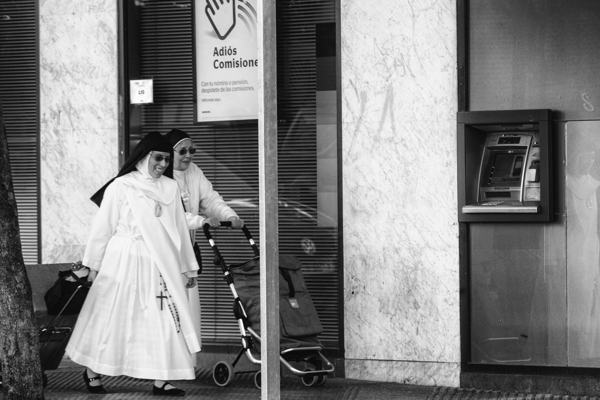 Une photo prise à Madrid. Des soeurs poussent leurs caddies. Dans une seconde, elles passeront devant le distributeur de billets d’une banque qui a supprimé ses commissions. Elles rient. On est aux anges.