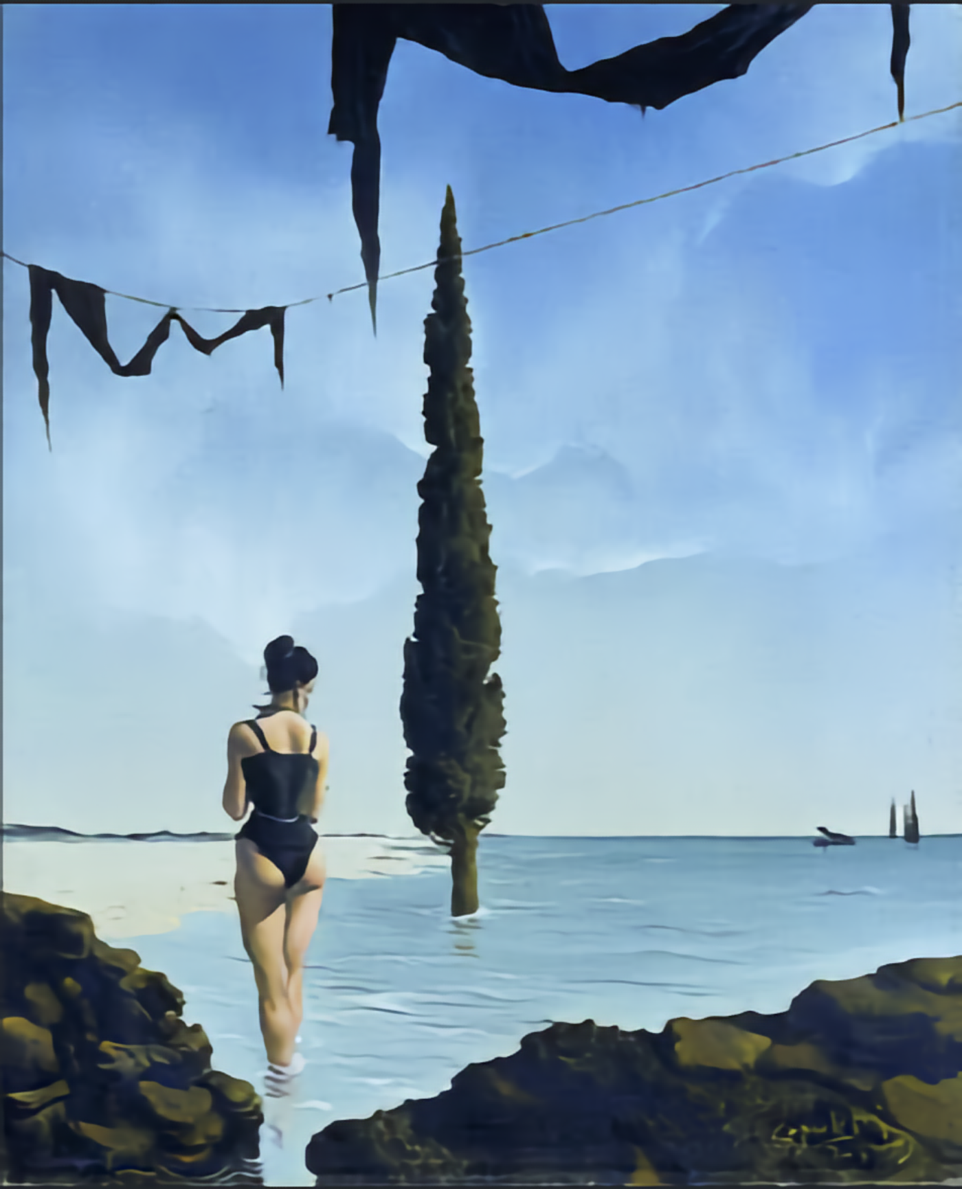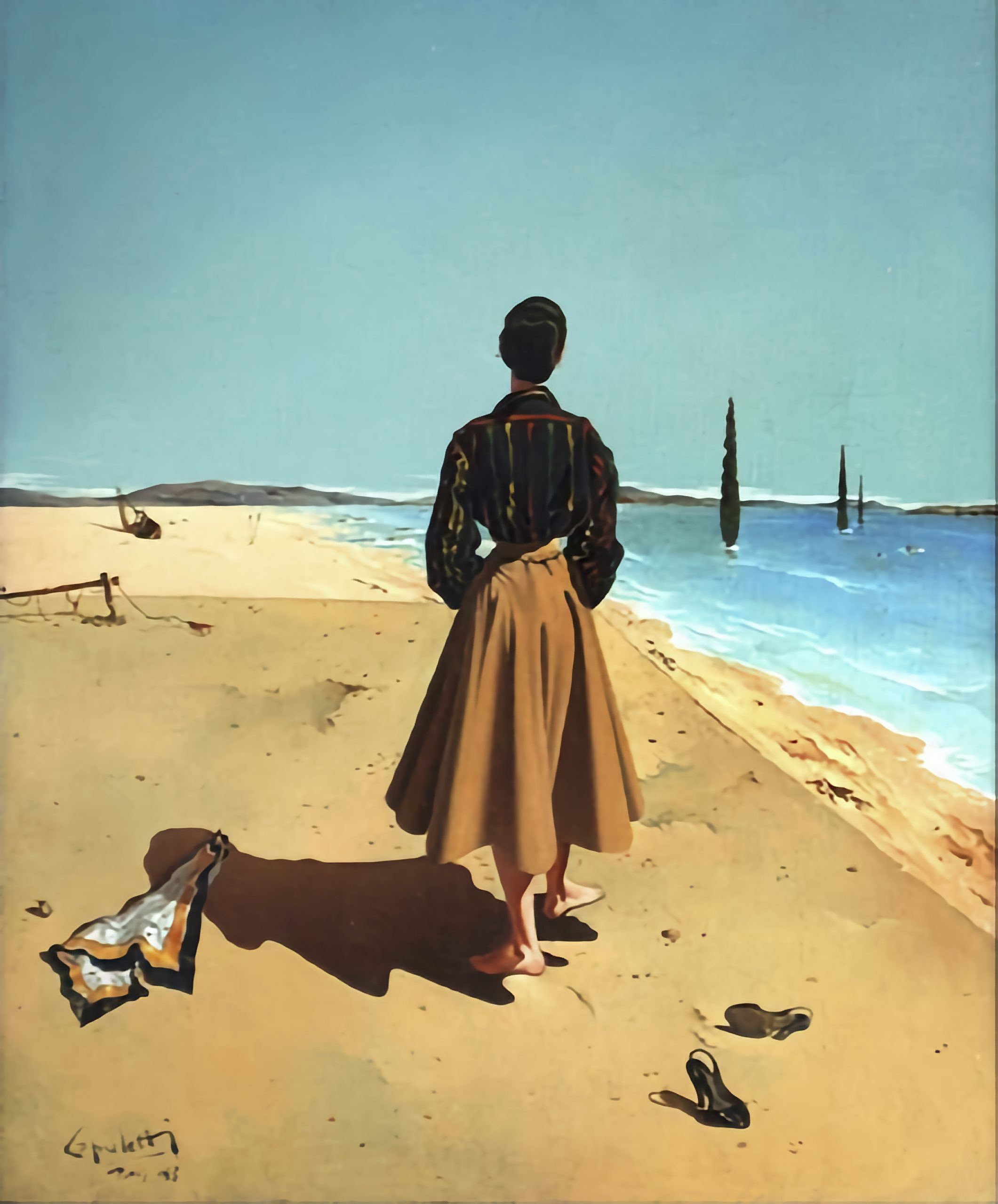 Elle n’a pourtant rien de particulier. C’est, comme son titre l’indique, “une dame à la plage”. Cependant, elle intrigue, elle accroche l’oeil plutôt, l’on ne sait pourquoi. C’est ce qui distingue une oeuvre d’un dessin d’amateur. Le foulard ? Les chaussures ? La démarche peut-être, pieds vers l’extérieur, assez hispanique, les pins dans la mer qu’on retrouve dans un autre tableau (voir ci-dessous). Certainement la crudité des couleurs.
