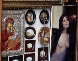PS. La photo en tête a été prise à Naples. La vitrine du vendeur est « pragmatique ». La relique religieuse qui côtoie la femme splendide aux seins nus ne peut gêner, il n’existe pas de conflit entre ces deux modes d’appréhension du monde. Il faut être d’accord avec tout, il faut être pragmatique. Surtout quand ça fait vendre.”