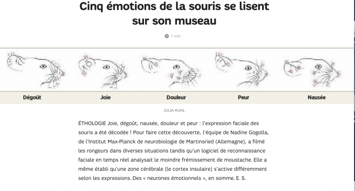 Et quand, dans le dernier “Science et Avenir” que j’ouvre immédiatement, dès sa parution, j’ai lu l’article sur les “souris”, le policier et les enlacements après le whisky du détective, l’ont emporté sur la science des émotions animales. On ne se refait pas. Heureusement.
