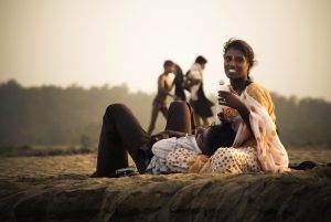 Plage de Mahabalipuram, à 100 kms de Chennai (Madras). L’homme ne voit pas le photographe, il est dans l’extase la plus radicale, celles des yeux véritablement fermés. Avez-vous remarqué que sa bouteille d’eau, la même certainement que celle que la femme tient dans sa main gauche, est appuyée sur le sexe ?. Juste appuyée, immobile et invisible pour accompagner et sentir l’extase. Rien ici de choquant, de pervers.