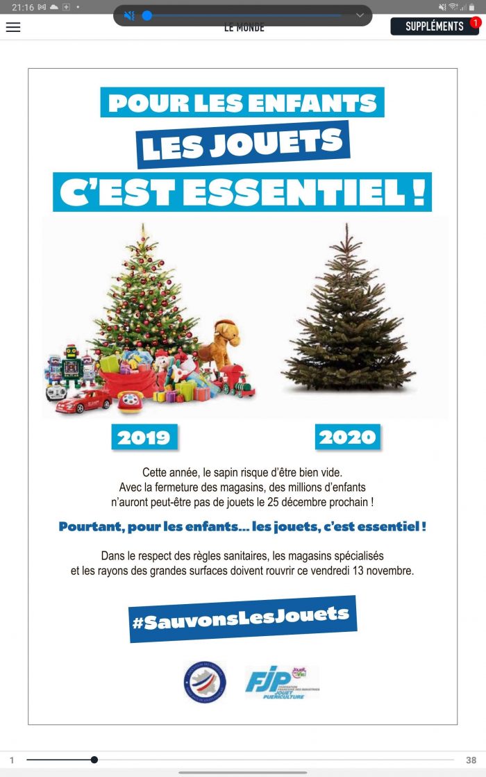 Après les libraires, le théâtre, le cinéma, et à vrai dire tous les commerces, voici arrivés les jouets. Essentiels pour les gamins, évidemment.