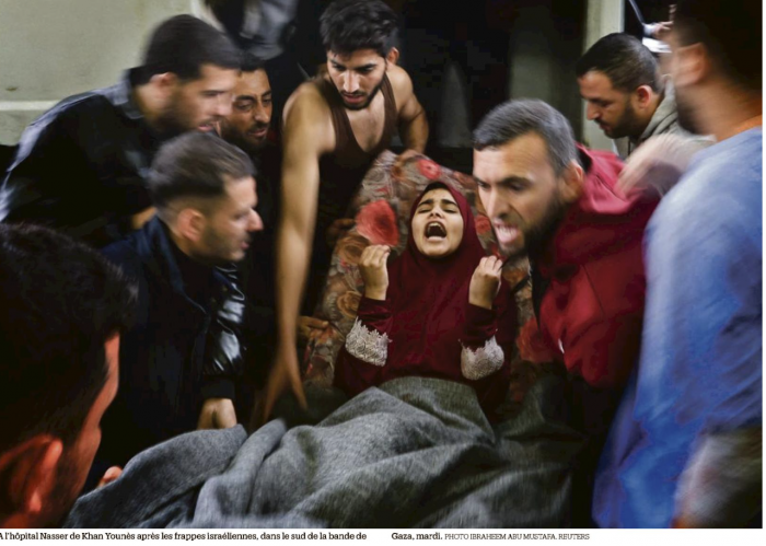 Galeries. «Depuis la rupture de la trêve, chaque jour est plus épouvantable que la veille», dit un habitant de Khan Younès, joint brièvement par téléphone. La férocité de l’offensive israélienne ces dernières quarante-huit heures dans le sud de Gaza sème la terreur et la mort, en particulier dans la ville de plus de 400 000 habitants. Habitants qui partent désormais plus au sud. Mardi, les autorités militaires israéliennes affirmaient que leurs troupes se trouvaient «au cœur de Khan Younès». «Nous avons reçu l’ordre des Israéliens d’évacuer des centaines de milliers de personnes, qui ont déjà été déplacées une première fois du nord vers le sud», indique à Libé Tamara Rifai, directrice des relations extérieures de l’UNRWA. L’agence de l’ONU pour les réfugiés palestiniens, qui abrite plus de 1,2 million de civils dans ses écoles et locaux divers depuis le début de la guerre, estime que 80 % de la population de Gaza, soit 1,8 million de personnes, a été déplacée. C’est le plus grand exode de Palestiniens depuis 1948, souligne l’UNRWA.