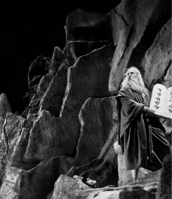 Il existe deux Les Dix Commandements par Cecil B. DeMille. Dans le premier, réalisé en 1923, Moïse guide d’abord les Hébreux hors d’Égypte, puis la deuxième partie se déroule à l’époque contemporaine. Pour son auto-remake, le cinéaste use avec joie du Technicolor, reste perpétuellement avant Jésus-Christ, et développe une part de la légende qui n’est pas dans la Bible : le temps passé par Moïse aux côtés de son cousin Ramsès II, à la cour du pharaon Séthi Ier.