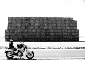 Un premier œil, celui de l’esthète de service, bourré de technique. Il décèle la construction, regrette la brulure (photographique) des éléments, critique l’absence de correction dans les hautes lumières. Il ne s’arrête à rien, ne voit pas le personnage, n’admire pas la moto, n’est pas subjugué par la géométrie du rectangle de foin, posé, au bord d’une route, presque nulle part.