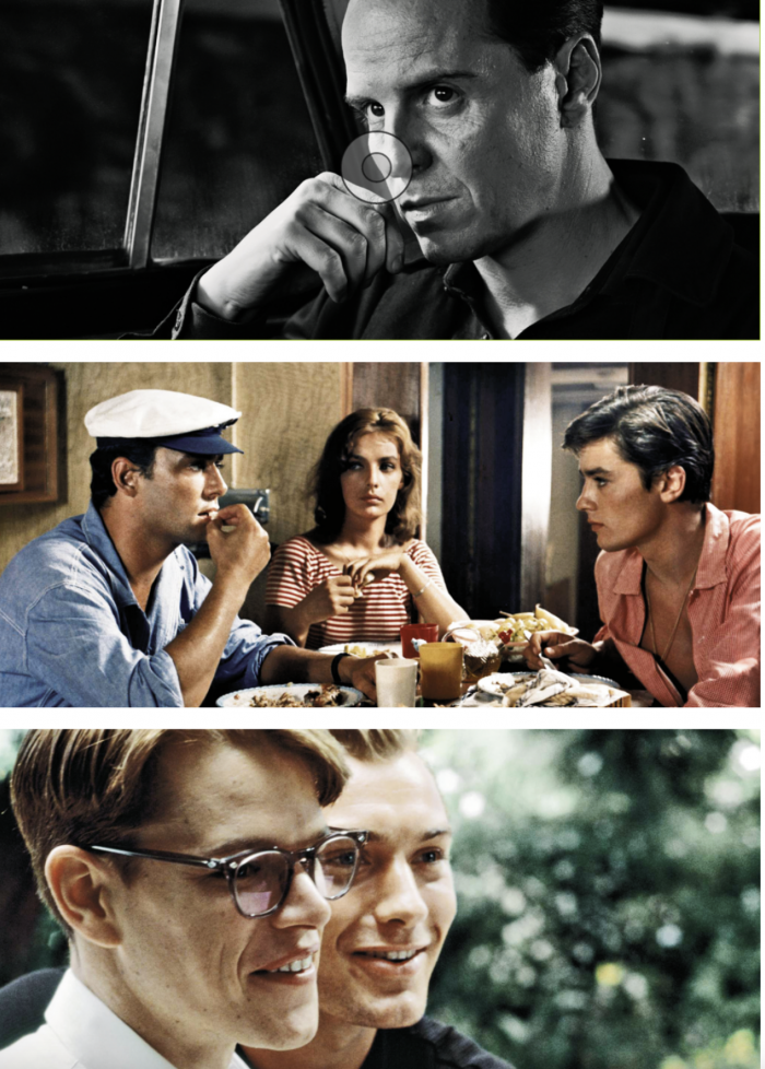 De haut en bas, trois interprètes de Tom Ripley : Andrew Scott, dans la minisérie de Steven Zaillian. Alain Delon dans « Plein Soleil », de René Clément (1960). Matt Damon dans « Le Talentueux Mr Ripley », d’Anthony Minghella (1999). Photo stefano cristiano montesi/2023 Netflix, Inc. | Pari films | Paramount