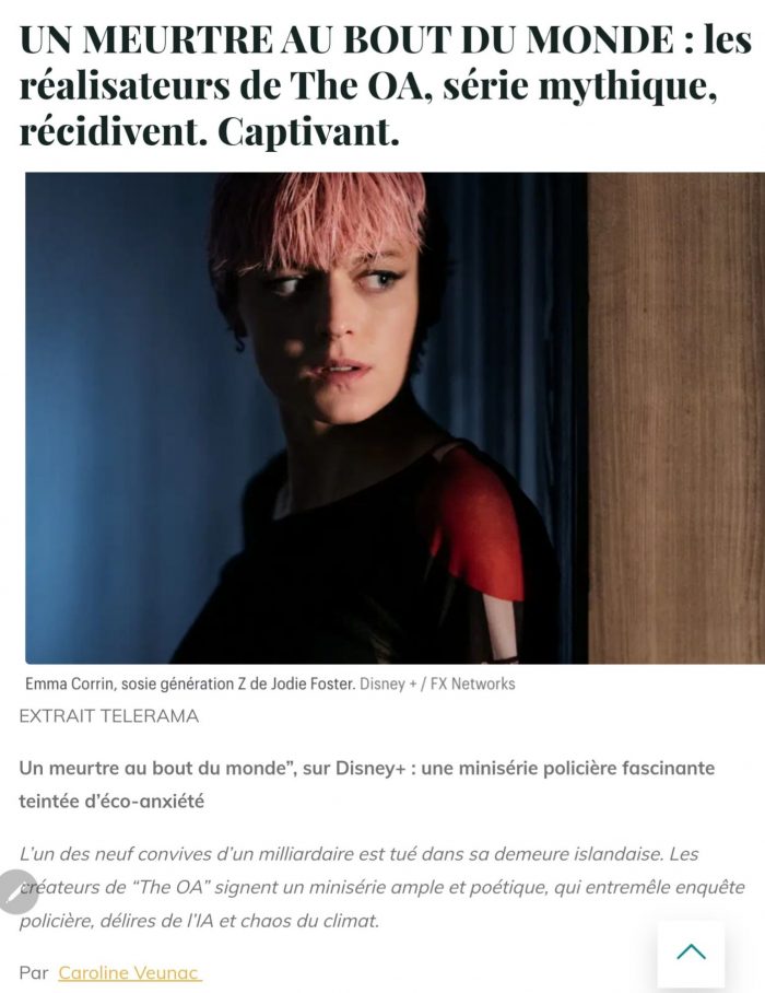 Uncategorized série : un meurtre au bout du monde 17/12/2023 mbéja Excellente série. Emma Corin splendide. Par les réalisateurs de The OA. Sur Disney .