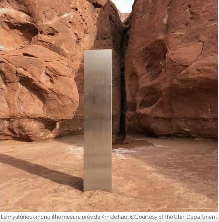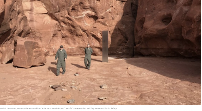 “Sur fond de roches rouges, le monolithe d’acier, aux 3 faces réfléchissantes, se dressait de tout son long sur près de 4 mètres. L’objet a été découvert en plein milieu du désert de l’Utah, dans le sud-ouest des États-Unis le 18 novembre dernier par les agents du Département de la sécurité publique (DPS) lors d’un survol en hélicoptère. Les photographies diffusées par l’équipe sur les réseaux sociaux avaient depuis alimenté les spéculations les plus folles quant à l’origine et à la signification de ce curieux artefact, planté dans le sol. Si certains y reconnaissaient l’œuvre d’un artiste contemporain, d’autres voulaient croire à une manifestation extraterrestre.