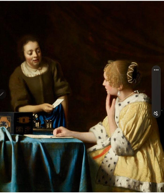 Le thème de l’écriture et de la réception de lettres, qui revient souvent dans l’oeuvre de Johannes Vermeer, est représenté ici avec une tension dramatique exceptionnelle. Les deux femmes sont saisies sur le vif, dans un moment critique mystérieux. Le manque de finition au niveau de la tête de la maîtresse d’une part et l’arrière-plan relativement uni d’autre part indiquent que cette œuvre tardive de Johannes Vermeer est inachevée. Néanmoins, l’artiste n’a que rarement (voire jamais) surpassé les effets subtilement variés de la lumière que l’on voit ici se refléter sur les bijoux en perles, scintiller sur les objets en verre et en argent disposés sur la table, et baigner les personnages d’une douce lueur dans leur décor sombre. M. Frick achète le tableau en 1919, année de sa mort. Cette dernière acquisition rejoint ses tableaux favoris : “Autoportrait” (Rembrandt), “Portrait de Thomas More” (Holbein), “L’Extase de saint François” (Bellini) et “Philippe IV” (Vélasquez).