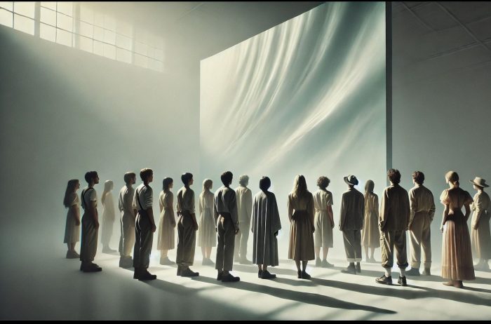 Une image représentant un groupe de 10 personnes,de tous âges de dos regardant un mur blanc, mélange de rêve et de surréalisme.